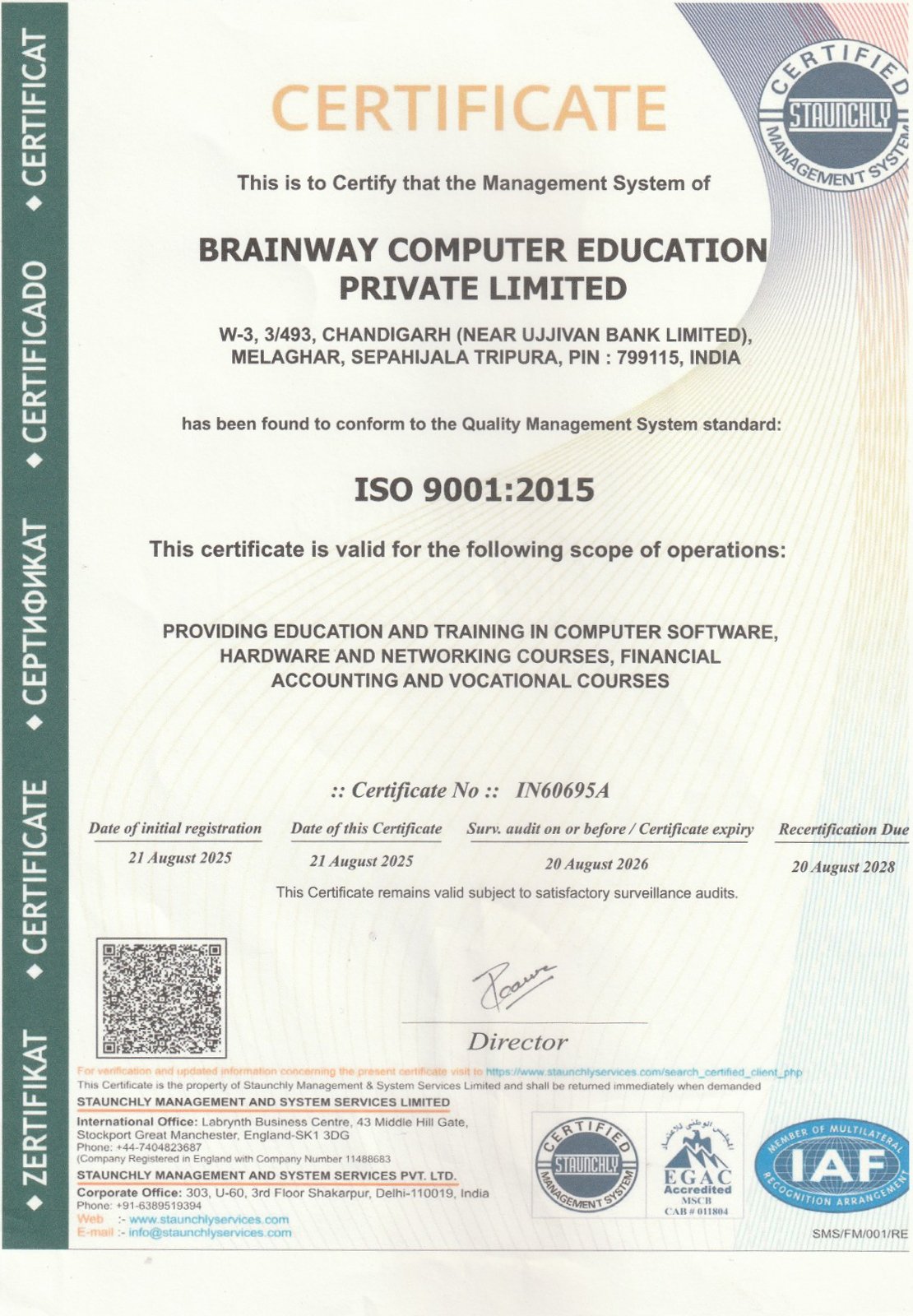 BRAINWAY COMPUTER EDUCATION PVT. LTD. is An ISO 9001:2015 certified Institution. In this era of globalization the need fullness of computer education can hardly be over emphasized. The BRAINWAY is now hell - bent upon spreading its wings through franchisee throughout the length and breadth of the country. We have international level syllabus like Software, Hardware, Website Development, Accounting, Multimedia & Animation and Networking, CAD, Mobile Technology, Spoken English, Data Entry and E-Typing Programs and flexible course materials (instructional materials which are prepared with meticulous care by experts and experienced scholars for the accessibility of the learners in general. Training is conducted in comfortable and spacious labs equipped with computers which are constantly updated with the latest technology. Affordable fees structure along with easy installment facilities tends to make our courses reachable to all. The dedicated and qualified faculty member of the BRAINWAY are always keen on guiding the students aright so that they can get placement opportunities in reputed companies after the completion of the course.